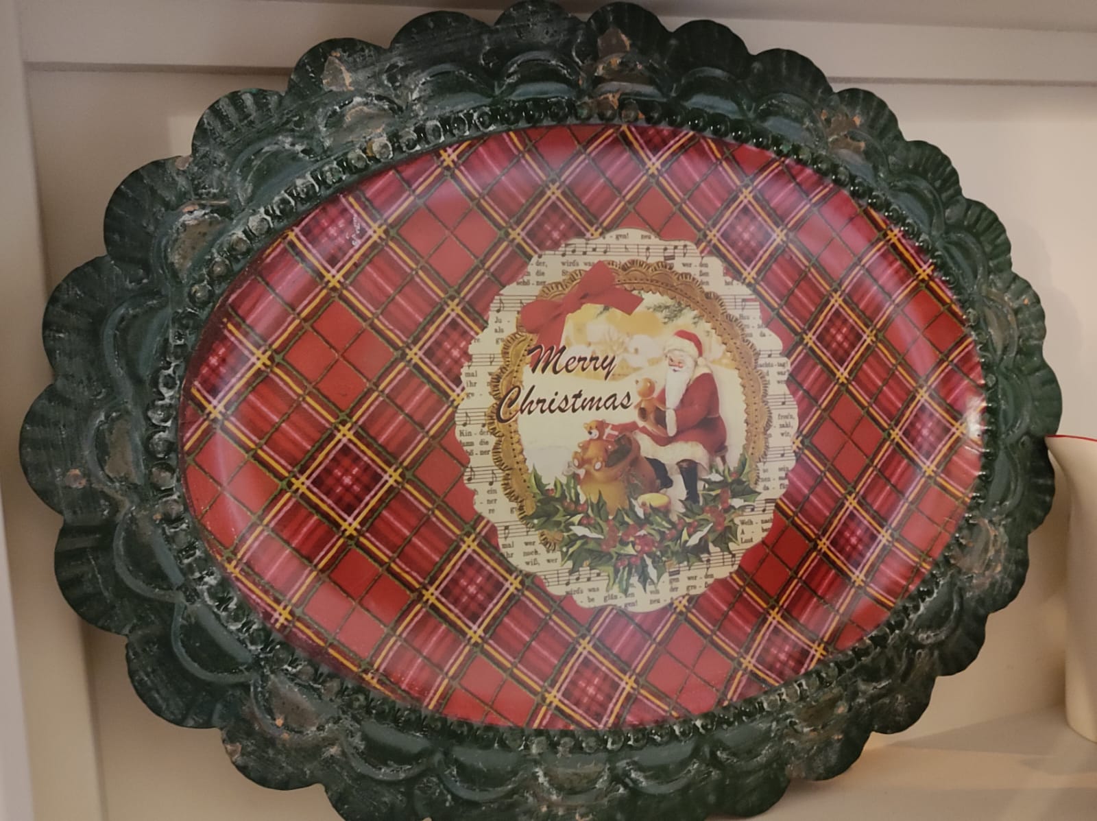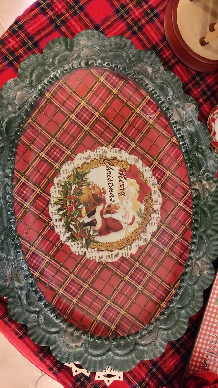 Vassoio latta con decoro tartan e babbo Natale cm 46x33